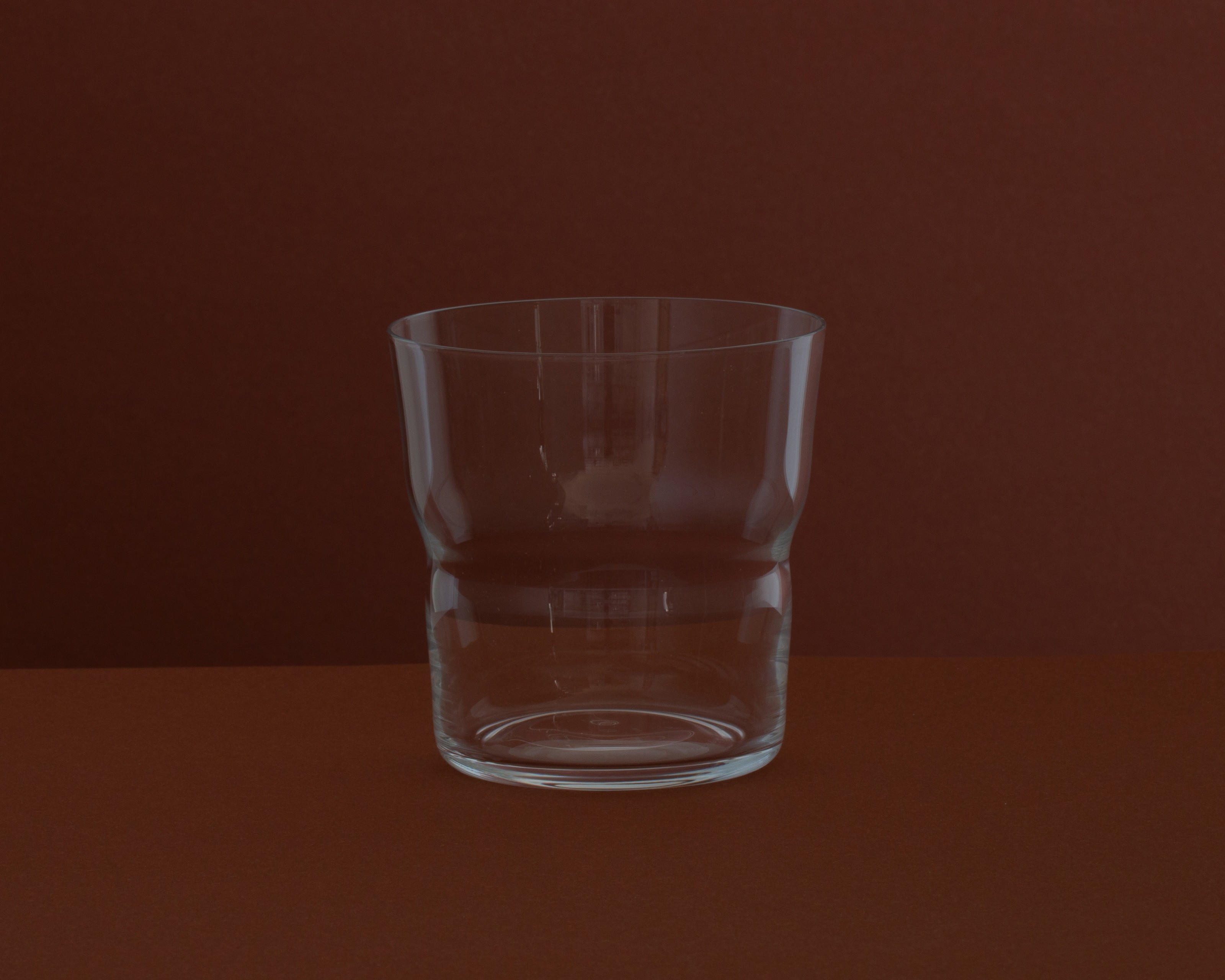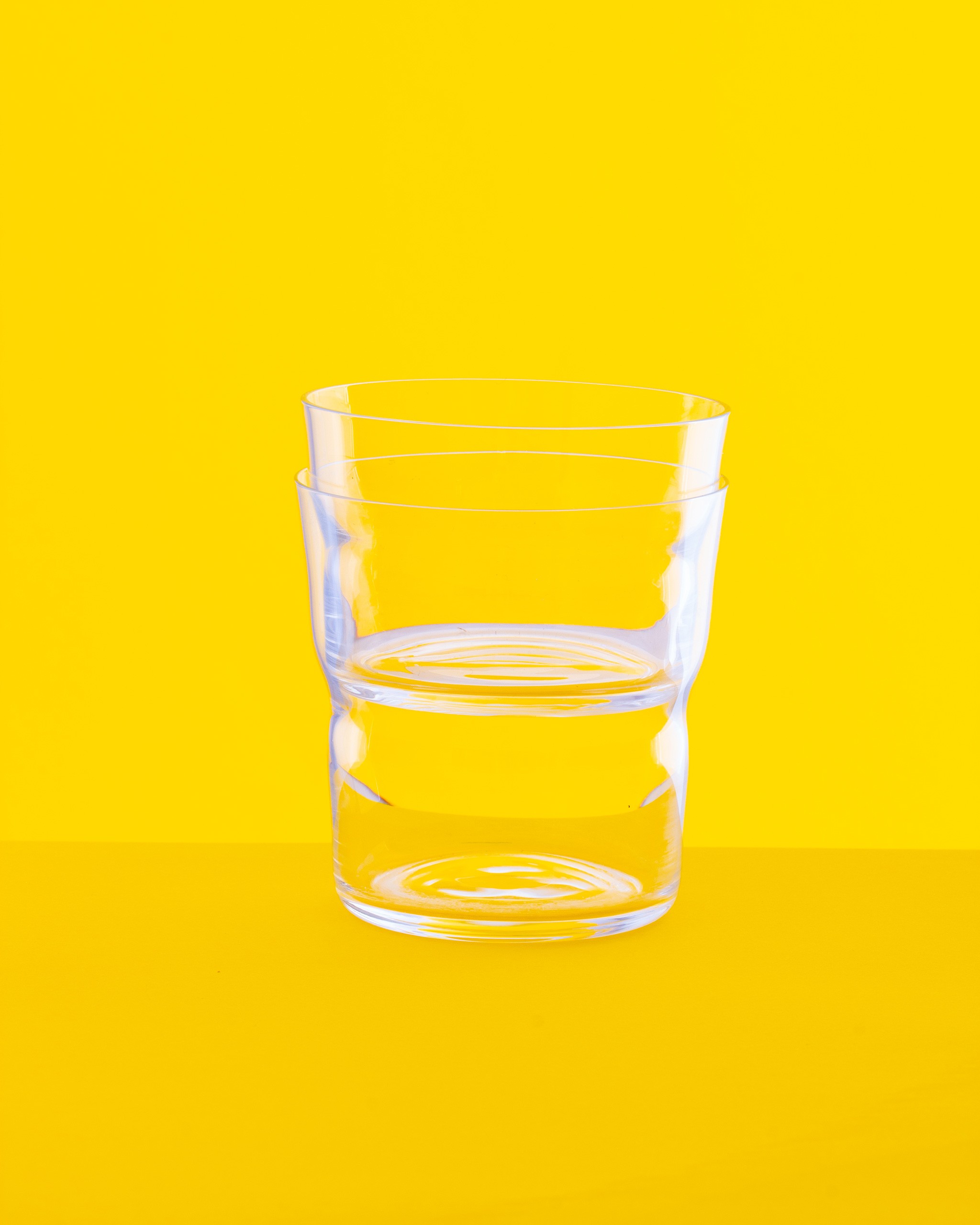 Paired along with these glasses are a low and tall stacking tumbler and water carafe which take their shape from an ergonomic indent.