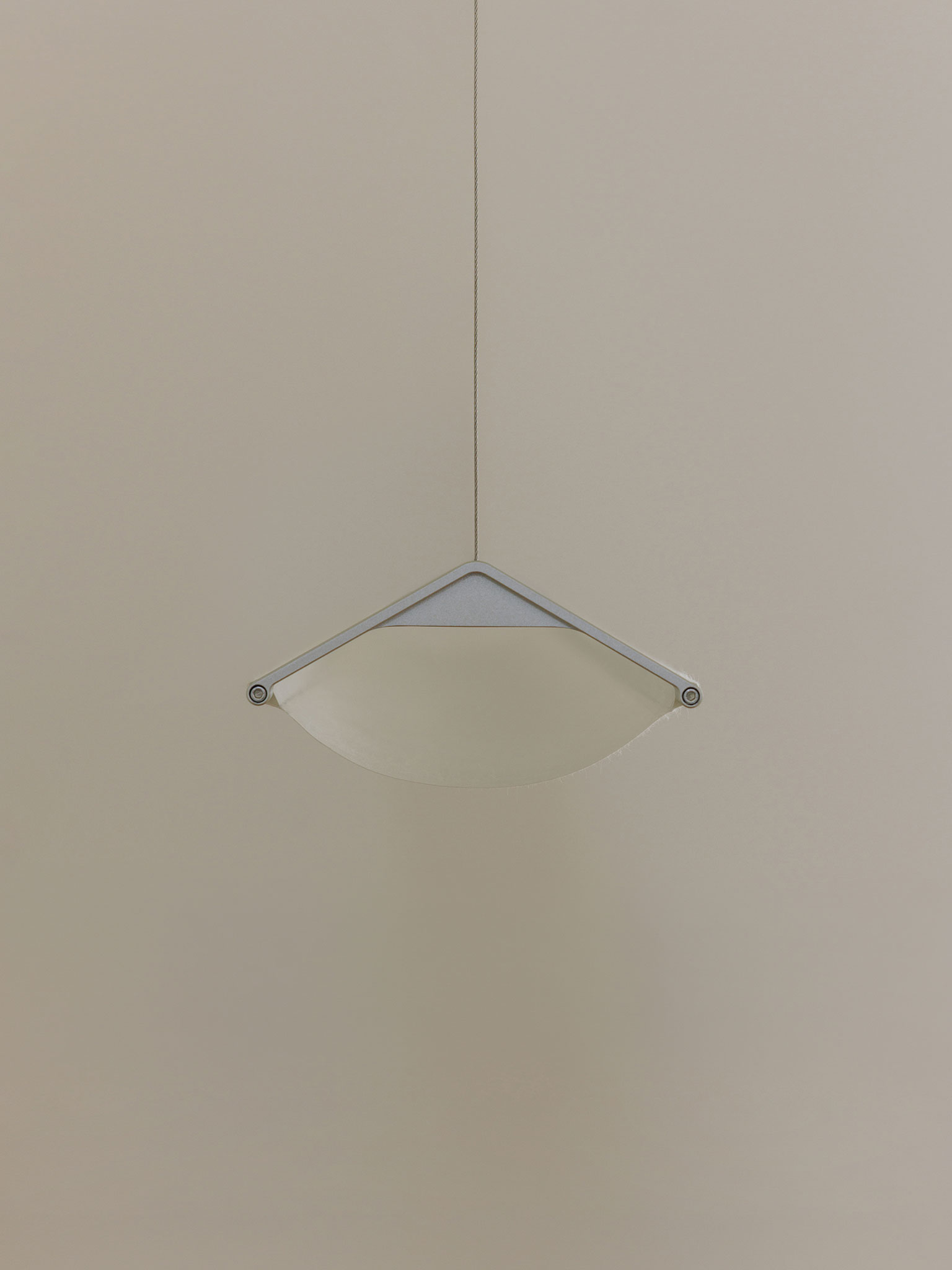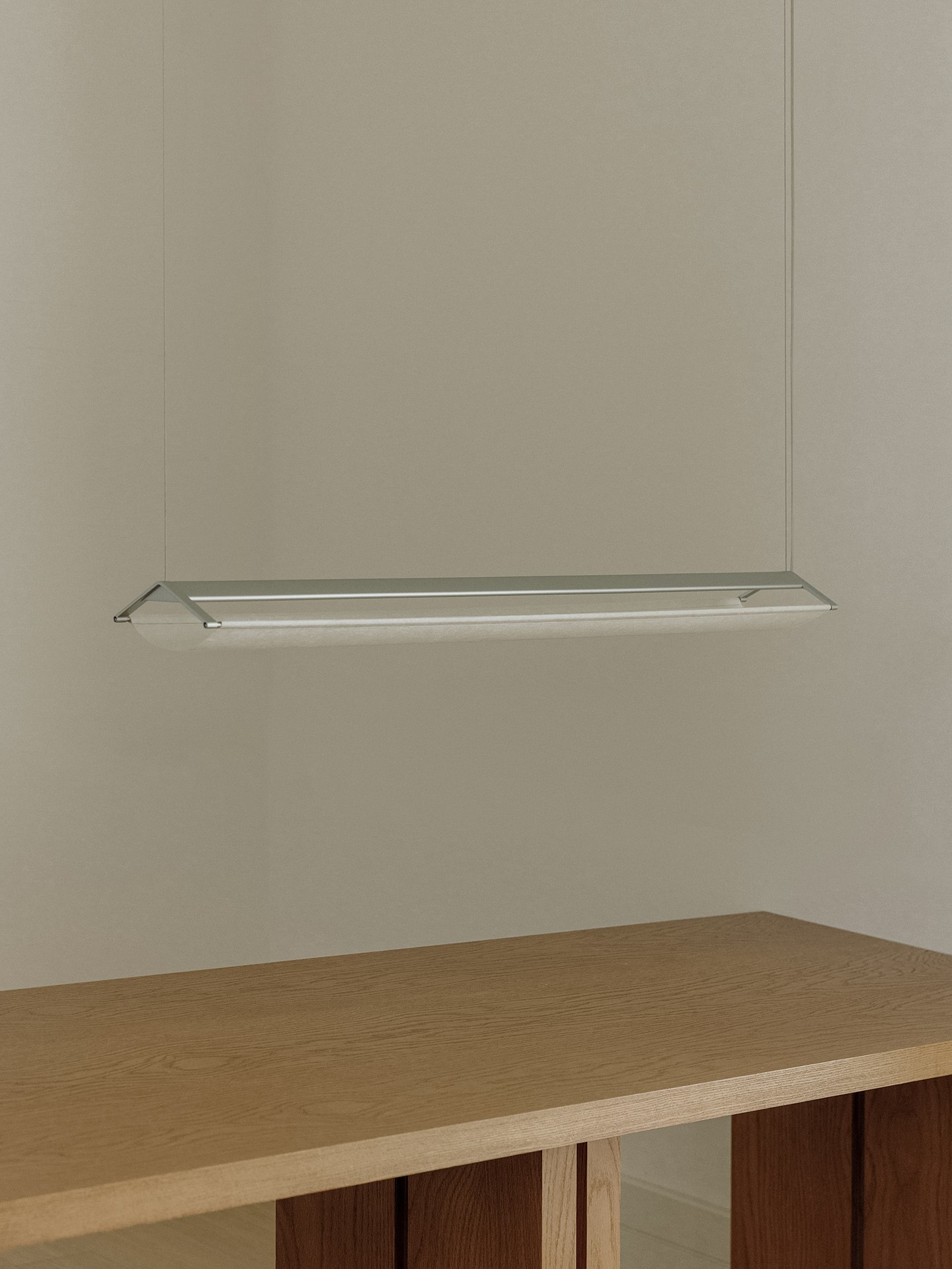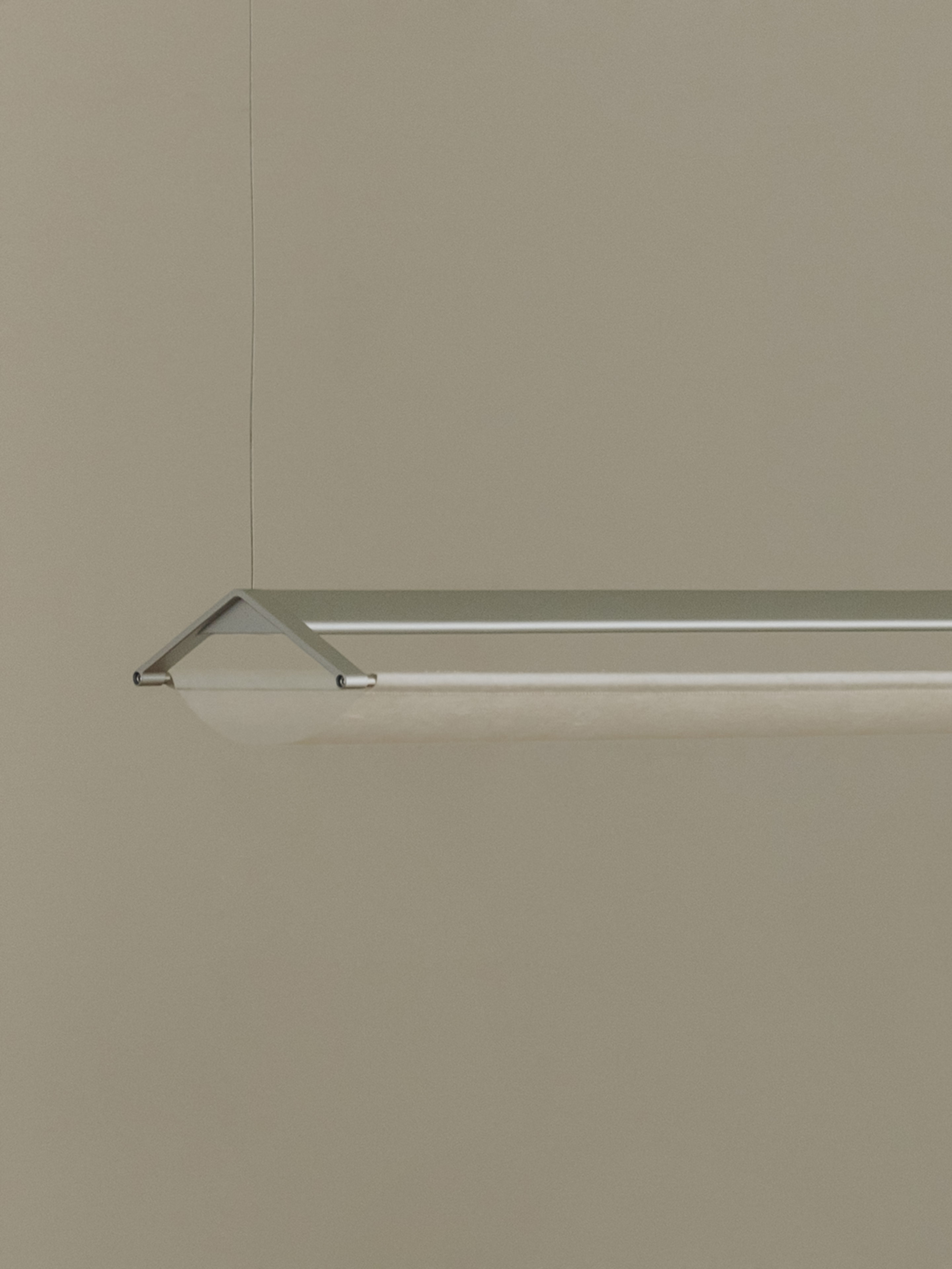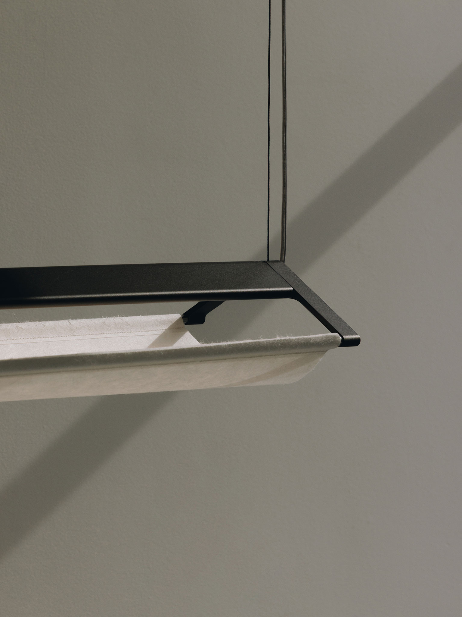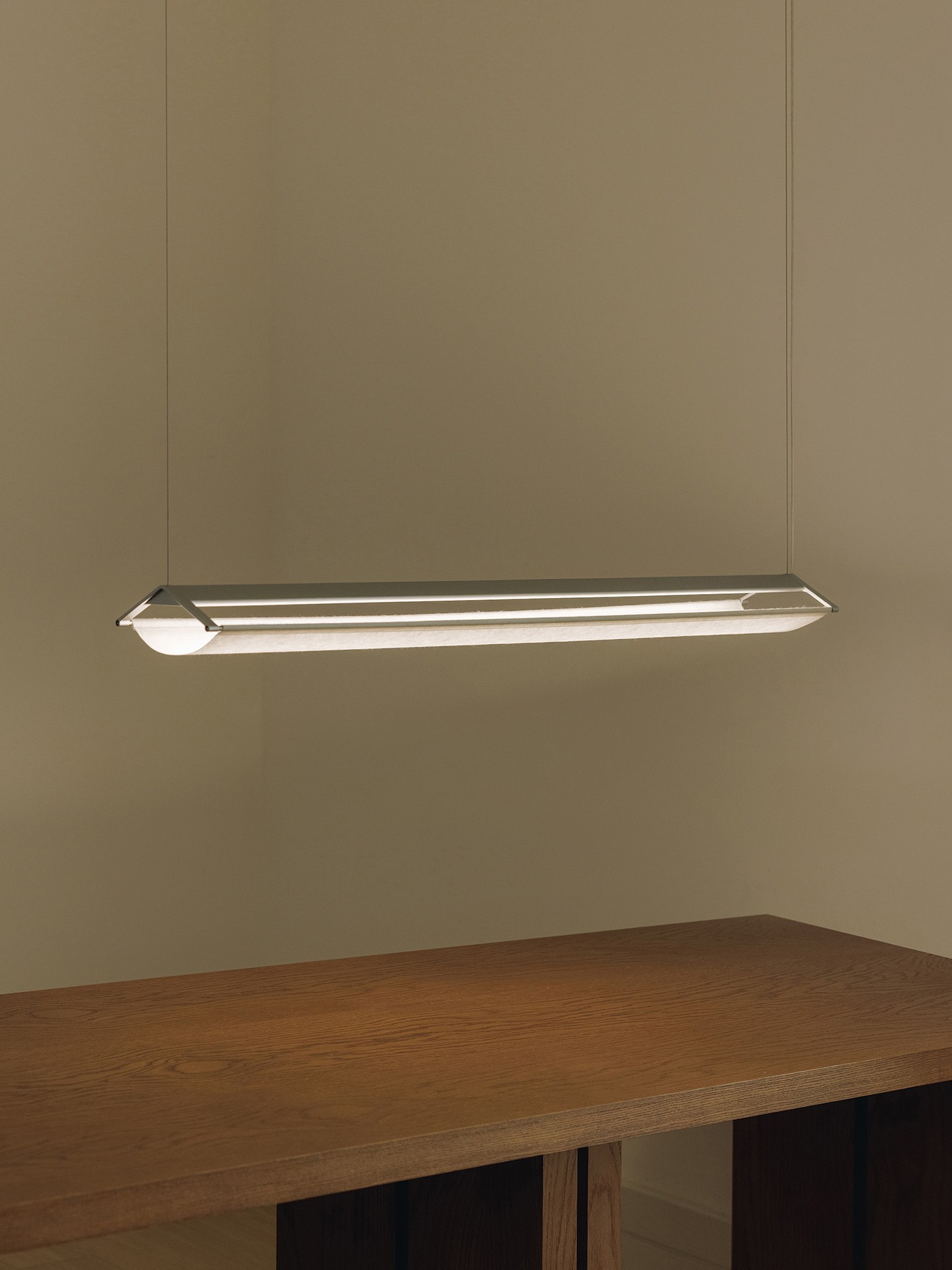 Yeon is a linear pendant lamp that uses mulberry (Hanji 한지) paper, traditionally used in Korean kite-making. The delicate paper diffuser is set against an extruded aluminum profile that forms the body.